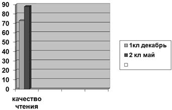 Рисунок 2 - показатели качества чтения учащихся контрольного класса Показатели скорости чтения учащихся в экспериментальном классе значительно увеличились во втором классе по сравнению с первым годом обучения. В контрольном классе эти показатели претерпели незначительные изменения. Это видно из таблиц 4 - 5. Таблица 4 – процентные показатели скорости чтения к концу первого класса