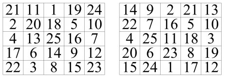 Испытуемому предъявляют первую таблицу: "На этой таблице числа от 1 до 25 расположены не по порядку". Затем таблицу закрывают и продолжают: "Покажи и назови все числа по порядку от 1 до 25. Постарайся делать это как можно быстрее и без ошибок". Таблицу открывают и одновременно с началом выполнения задания включают секундомер. Вторая, третья и последующие таблицы предъявляются без всяких инструкций. Тестовый материал[35]