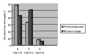 Из данных таблицы 2 видно, что к первой группе относится 42,9%, что на 12,7% меньше чем у первородящих женщин. Возрастает численность респондентов относящихся ко 2 и 3 группе на 11,4% и 1,3% соответственно, по сравнению с первородящими женщинами. Это свидетельствует о том, что у женщин со второй беременностью уровень тревожности, и связанные с ними расстройства возрастает. Более наглядно эти данные представлены на рисунке 1.