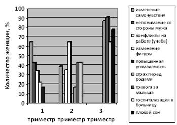 Таким образом, в I триместре беременная женщина не ощущает и не осознает беременности, и беспокойство вызывает, изменение её физиологического основы (самочувствие - 65%, фигура - 22%, повышенная усталость - 17%). Одним из стрессогенных факторов является восприятие окружения женщины её беременность (мужа, родственников - 43%, коллег по работе - 34%).