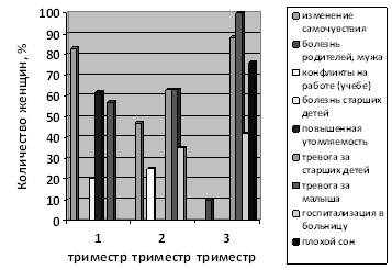 Из рисунка 3 наглядно видно, что воздействие стрессогенных факторов показывает динамику изменения психологии женщины, основанной на ее физиологическом состоянии. Прежде всего, в первом триместре у женщин беспокойство вызывают изменения которые происходят в организме (самочувствие - 83%, повышенная усталость - 62%), и тревожность за будущего малыша (57%) и старших детей (20%). Во втором триместре выделены следующие стрессогенные факторы: тревога за будущего малыша (63%) и старших детей (63%). Изменения происходящие в самочувствии женщины беспокоят меньше (47%). В третьем триместре тревожность за детей увеличивается - основным стрессогенным фактором в данный период (будущий ребенок - 100%, старшие дети - 88%). Также, неудобство доставляют некоторые физиологические изменения (76%).