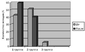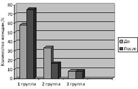 Данные таблицы свидетельствуют о том, что 58,3% респондентов относятся к группе здоровых беременных женщин, находящихся в состоянии психологического комфорта, 33,4% ко второй группе и лишь 8,3% к третьей группе. На рисунке 4 видно, что сравнивая данные до проведения работы психологической поддержки и после, видно, что из числа первородящих женщин группе здоровых беременных женщин относится 75%, что на 16, 7% больше чем до экспериментальной работы, число женщин относящихся ко второй группе также сократилась в 2 раза, но к третьей группе, как и при первоначальном тестировании относится 8,3% (1 беременная женщина).