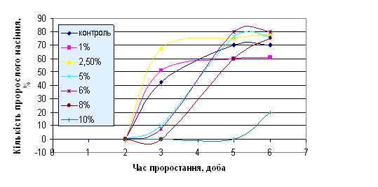2.4 Статистично-математичне опрацювання результатів нафтовий забруднення ґрунт льон Досліди проводили у п’ятикратній повторності. Отримані результати опрацьовували статистично з використанням програмного пакета Microsoft Excel для персональних комп’ютерів. Визначали середнє арифметичне, стандартну похибку. Достовірність різниці між контрольним і дослідними варіантами оцінювали за критерієм Стьюдента; вірогідними вважали різниці, де Р<0,05 (Кучеренко, 2001). 3. РЕЗУЛЬТАТИ ДОСЛІДЖЕНЬ ТА ЇХ ОБГОВОРЕННЯ 3.1 Залежність процесу проростання насіння льону звичайного (Linum usitatissimum L.) від концентрації нафти у ґрунті Для проростання насіння необхідні певні умови, передусім – вода. Процес проростання насіння розпочинається після адсорбції води крізь мікропіле та насіннєві оболонки завдяки біоколоїдам, якими є білки, крохмаль, геміцелюлоза, пектинові речовини. Набрякання цих речовин створює силу для розриву оболонки. Зародок збільшується у розмірах завдяки росту клітин розтягуванням і поглинанню води. Зародковий корінець виходить унаслідок розриву насінної шкірки і насінину вважають пророслою (Терек, 2007). Нами встановлено, що залежно від концентрації у ґрунті нафта по-різному впливає на проростання насіння льону звичайного (Linum usitatissimum L.). Криві динаміки проростання насіння в часі ілюструють, що при низьких концентраціях нафти насіння проростає швидше, ніж у контролі (рис. 3.1). На 3-тю добу при забрудненні 1% нафти у ґрунті кількість пророслого насіння на 9% більша, ніж у контролі, при 2,5% нафти – на 15%. При даних концентраціях криві динаміки проростання насіння швидше виходять на плато (кількість пророслого насіння досягає максимального значення на 4-ту добу). У контролі досягнення максимуму схожості спостерігається на 5-ту. Отже, нафта при низьких концентраціях (1%, 2,5%) сприяє виходу насіння із стану спокою та стимулює проростання насіння. Це можна пояснити стимулюючою дією нафти при низьких концентраціях (Грищенко, 1982). Встановлено, що стимулюючий ефект мають поліароматичні вуглеводні (ПАВ) як компоненти нафти, зокрема флуорен, антрацен, пірен, хризен. При низьких концентраціях (10 мг/кг). спостерігалося стимулювання росту рослин на ранніх етапах розвитку для таких досліджуваних видів, як пшениця - Triticum vulgare Vill, овес - Avena sativa L., кукурудза - Zea mays L., помідори - Lycopersicon esculentum Miller, квасоля - Phaseolus vulgaris L, соняшник - Helianthus annus L. (Maliszewska-Kordybach, 2000). У концентраціях 5%, 6% та 8% нафта значно пригнічує процес проростання насіння. Кількість пророслого насіння на 3-тю добу при 5% нафтового забруднення зменшується на 32%, а при 6% – на 34% щодо контролю. Криві динаміки проростання досягають свого плато, як і в контролі, на 5-ту добу. При забрудненні 8% насіння починає проростати лише на 4-ту добу, а плато настає на 6-ту добу. При нафтовому забрудненні 10% насіння проростає на 6-ту добу. Отже, при високих ступенях нафтового забруднення швидкість проростання насіння гальмується, що зумовлено високою токсичністю нафти. Таким чином, швидкість проростання насіння залежить від концентрації токсиканта, що буде враховано при розробці методу фітооцінки токсичності нафтозабруднених ґрунтів.