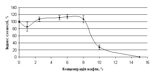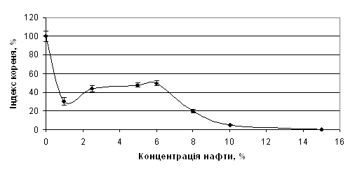 Рис. 3.2. Індекс схожості насіння льону звичайного (Linum usitatissimum L.) за дії різних концентрацій нафти у ґрунті Отримані нами результати свідчать, що динаміка проростання та схожість насіння льону звичайного (Linum usitatissimum L.) є чутливими та інформативними тест-реакціями для оцінки токсичності нафтового забруднення ґрунту. Такі тест-реакції є перспективними для проведення фітооцінки нафтозабрудненого грунту, на їх основі можна розробляти методичні рекомендації для фітоіндикації нафтозабруднених територій. 3.2 Морфометричні параметри проростків Linum usitatissimum L. як тест-реакції на дію нафтового забруднення ґрунту Зручними об’єктами для біоіндикації забруднювачів є проростки рослин (Гродзинський, 2006; Горова, 2005). Нафта впливає на всі етапи онтогенезу рослин, серед яких найбільш чутливими є проростки. При дослідженні фітотоксичності нафти було показано, що нафтове забруднення значно інгібує ріст і розвиток рослин (Киреева, 2007). Як морфометричний показник ми вимірювали довжину коренів та пагонів проростків та визначали індекс кореня (ІК) льону звичайного. Було встановлено, що за дії нафти відбувається інгібування росту кореня. Індекс кореня при вмісті нафти 1%, 2,5%, 5%, 6% зменшується відповідно на 70, 66, 63, 61% щодо контролю (рис. 3.3.). ІК при цьому слабо змінюється, утворюючи пологе плато. А при вищих концентраціях відбувається подальше зменшення ІК: при 8% – на 80%, при 10% - на 94%. Пригнічення росту кореня зумовлене токсичністю нафти, яка через водний розчин взаємодіє із проростками (Linder at al, 1990). Схожість насіння ілюструє прямий вплив нафти, тоді як довжина проростків є реакцією на опосередкований вплив водорозчинних нафтопродуктів. Це свідчить про високу чутливість досліджуваної тест-реакції та лінійну залежність кривої „доза-ефект”. Отже, ІК чутливо реагує на токсичність нафти. Прямолінійна залежність між індексом кореня та концентрацією нафти у ґрунті спостерігається на проміжку 6–10% забруднювача. Це дозволяє використовувати ІК при проводити діагностиці вмісту нафти у ґрунті в цьому інтервалі.
