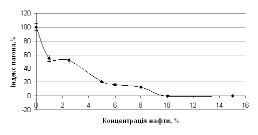 Рис. 3.4. Індекс пагона льону звичайного (Linum usitatissimum L.) за дії нафти у ґрунті Параметр, який об’єднує ІС, ІК та ІП, є індекс проростання насіння (ІПН). Очевидно, даний показник мав би бути найбільш достовірним та інформативним, оскільки інтегрує найтиповіші тест-реакції досліджуваного об’єкта. Отриманий індекс проростання дійсно найповніше відображав ступінь токсичності нафти (див. рис.3.9). Так при концентрації нафти 1% ІПН зменшується до 14,3%, при 2,5% – до 24,5% (рис. 3.5.). Вже при низьких концентраціях нафти фіксується значне відхилення щодо контролю. При послідовному зростанні вмісту нафти до 5%, 6%, 8%, 10% ІПН становить відповідно 11,1%, 9,2%, 2,6%, 1,4%. Інтегрування тест-показники дозволить суттєво збільшити діагностичну продуктивність тест-системи.