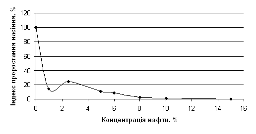 Рис. 3.5. Індекс проростання насіння льону звичайного (Linum usitatissimum L.) ВИСНОВКИ На основі отриманих даних можна зробити наступні висновки: 1. Встановлено, що нафта при низьких концентраціях (1%, 2,5%) сприяє виходу насіння із стану спокою та стимулює проростання насіння Linum usitatissimum L, при високих (5%, 6% та 8%, 10%) – пригнічує 2. Індекс схожості різкщ зменшення при високих концентраціях нафти у грунті (10%). 3. Отримані нами результати свідчать, що динаміка проростання та схожість насіння льону звичайного (Linum usitatissimum L.) є чутливими та інформативними тест-реакціями для оцінки токсичності нафтового забруднення ґрунту. Такі тест-реакції є перспективними для проведення фітооцінки нафтозабрудненого грунту, на їх основі можна розробляти методичні рекомендації для фітоіндикації нафтозабруднених територій. 4. Встановлено прямолінійну залежність між індексом кореня та концентрацією нафти у ґрунті на проміжку 6–10% забруднювача. 5. Встановлено лінійну залежність між індексом пагона L. usitatissimum та вмістом нафти у ґрунті: 6. Індекс проростання насіння – найбільш достовірний та інформативний параметр, який збільшує ефективність та чутливість тест-системи. 7. Досліджувані тест-реакції льону звичайного (Linum usitatissimum L.) доцільно використовувати при оціненні фітотоксичності нафтозабруд- неного ґрунту, на їх основі можна розробляти методичні рекомендації для фітоіндикації нафтозабруднених територій. ЛІТЕРАТУРА 1. Андресон Р.К., Мукатанов А.Х., Бойко Т.Ф. Экологические последствия загрязнения почв нефтью // Экология. – 1980. – №6. – С. 21-25. 2. Брагинський Л. П. Методологические аспекты токсикологического биотестирования на Daphnia magna Str. и других ветвистоусых ракообразних (критический обзор) // Гидробиол. журн. − 2000.− Т.36, №5. − С.50 3. Гідроекологічна токсикологія та біоіндикація забруднень / За ред. Олексіва І. Г., Брагінського Л. П. − Львів: Світ, 1995− 440с. 4. Горова А. І.,Скворцова Т. М., Клімкіна І. І, Павличенко, А. В., Бучавий Ю. В. Цитогенетичний моніторинг довкілля та здоровя людини // Вісн. Укр. Тов-ва генетиків і селекціонерів. – 2005. – Т. 3, №1-2. – С. 36-47. 5. Грищенко О.М. Ботанические аномалии как поисково-разведочный критерий нефтегазоносности // Экология. – 1982. - № 1. - С. 18-22. 6. Гродзинський Д.М., Шиліна Ю.В., Куцоконь Н.К., Михєєв О.М., Гуща М.І., Коломієць О.Д., Фалінська Т.П., Овсяннікова Л.Г., Кутлахмедов Ю.О., Пчеловська С.В. Застосування рослинних тест-систем для оцінки комбінованої дії факторів різної природи. – К.: Фітосоціоцентр, 2006. - 60 с. 7. Гродзинский А.М. и др. Прямые методы биотестирования почвы и метаболитов микроорганизмов // Аллелопатия и продуктивность растений: Сб.науч.тр. АН УССР. - К.: Наук. думка, 1990. – С. 121-124. 8. Екологічне право України. Академічний курс: Підручник. / За заг. Ред. Ю. С. Шемчушенка. − К.: Юридична думка, 2008. − С. 195. 9. Изменение численности и поведенческих реакций дождевых червей Lumbricus rubellus Hoffmeister в условиях загрязнения почв нефтьюНаучно-исследовательский институт биологии и биофизики при Томском государственном университете 634050 Томск, просп. Ленина, Сибирский экологический журнал, 2004, № 4, с. 463-466 10. Израэль Ю.А., Гасилина Н.К., Ровинский Ф.Я. Система наблюдений и контроля загрязнений природной среды в СССР // Метеорология и гидрология, – 1978. – № 10. – С. 5-12 11. Козлов К.С. Дождевые черви – биоиндикационный тест почв загрязненных нефтью // Материалы докладов межрегиональной науч