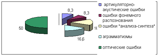 Рис. 1 - Показатели частотности ошибок письма у детей экспериментальной группы (в %) Из этих рисунков видно, что среди дисграфических, наиболее часто в исследуемой группе встречались оптические ошибки. Спектр данных ошибок был достаточно разнообразен и охватил все аспекты. Далее по количеству идут аграмматические ошибки и ошибки анализа и синтеза. У этих детей отмечено наличие ошибок, связанных с неумением выделять предложение из текста, слов из предложения, многочисленные пропуски и перестановки букв. Аграмматизмы чаще всего были представлены нарушениями управления и неправильным употреблением предлогов. Нарушения фонемного распознавания и артикуляционно-акустические ошибки были несколько меньше представлены, возможно, в связи с тем, что дефекты произношения к моменту обследования письма уже были устранены и поставленные звуки автоматизированы почти у всех исследуемых детей. 2.4 Анализ констатирующего эксперимента Итак, для систематизации нарушений письменной речи у детей с нарушениями зрения, мы воспользовались классификацией Р.И. Лалаевой. И ошибки были отнесены к пяти вышеописанным формам дисграфий: I – артикуляционно-акустическая, II – нарушение фонемного распознавания, III – нарушение анализа и синтеза письменной речи, IV – аграмматическая, V – оптическая, VI – дисорфографические ошибки. По результатам проведенного исследования можно сделать вывод о том, что проявления нарушений в письме младших школьников с нарушениями зрения чаще всего представлены оптическими ошибками Следует отметить, что в работах детей экспериментальной группы выделялась, не определявшаяся ранее в классификации (однако отмечаемая исследователями М.В. Сиротюк, А.Н. Корневым), смешанная дисграфия. Она была представлена у большинства детей. Смешанную дисграфию составляют различные комбинации из определяемых ранее форм нарушений письменной речи. М.В. Сиротюк выделяет 14 разнообразных комбинаций форм. Однако нами были выделены в сумме из двух групп, лишь 3 выявленных комбинаций форм, в силу того, что наше исследование охватило не столь большой круг испытуемых, и возрастной диапазон их был уже. Данные по двум группам представлены в таблице 7. Таблица 7 - Структура смешанной дисграфии у детей экспериментальной группы