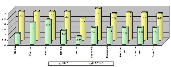 Качественный анализ проведенной диагностики показал, что у детей без речевых нарушений лучше всего сформировано согласование существительных и прилагательных в роде и числе (методика №6) – средний балл – 3. Также практически безошибочно дети без нарушений речевого развития выполнили методики №1-4, в которых исследовалось структурирование грамматических конструкций винительного, родительного, дательного, творительного падежа, о чем свидетельствует тот факт, что в данных диагностиках ни один ребенок контрольной группы не получил оценку 1 и 0. Средний балл в данных диагностиках составляет 2,7. Наибольшее затруднения у детей контрольной группы вызвало выполнение методики №5, в которой исследовалась структурирование словосочетаний с существительным в предложном падеже. Качественный анализ показал, что у детей контрольной группы еще не завершено формирование предложно – падежных конструкций данного падежа. В среднем, уровень сформированности грамматических конструкций у детей контрольной группы составил 2,6 балла, что говорит о высоком уровне развития грамматического строя детей 6 лет без речевых нарушений. 3.2 Анализ результатов диагностики уровня сформированности грамматических конструкций у детей экспериментальной группыРезультаты диагностики сформированности грамматических конструкций у детей с ОНР показали, что уровень развития данных функций у детей с экспериментальной группы значительно отстает от детей с нормальным речевым развитием. Дошкольники с ОНР при выполнении заданий допускали многочисленные ошибки, в ряде случаев не могли справиться с заданием даже с помощью экспериментатора. Наибольшие трудности у детей экспериментальной группы вызвали следующие задания: · структурирование словосочетаний с существительными в предложном падеже; · структурирование словосочетаний с существительными в дательном падеже; · структурирование словосочетаний с существительными в творительном падеже. Анализ результатов исследования сформированности грамматических конструкций позволил распределить детей экспериментальной группы по следующим уровням сформированности данной функции: а) средний уровень сформированности - у 10 детей (1,5 – 2,4 балла); б) низкий уровень сформированности - у 10 детей (0 – 1,4 балла). Количественный анализ результатов диагностики представлен в Таблице 2 Таблица 2 Результаты диагностики уровня сформированности грамматических конструкций детей экспериментальной группы