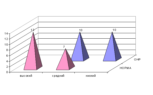Проведенное исследование выявило ярко выраженные различия в уровне усвоения грамматических конструкций у детей с ОНР и без нарушений речевого развития. У детей без речевых нарушений к 6 годам завершается формирование грамматических конструкций. В ходе диагностики мы выявили затруднения лишь в структурировании словосочетаний с существительными в предложном падеже. Результат выполнения диагностик нашего экспериментального исследования конструкций у детей без речевых нарушений составил 2,6 балла, что относится к высокому уровню сформированности грамматических конструкций. У детей с ОНР структурирование различных видов грамматических конструкций не сформировано. Функции словоизменения не развиты. Грамматические ошибки встречались практически в каждом задании. Результат выполнения диагностик нашего экспериментального исследования конструкций у детей с ОНР составил 1,4 балла, что относится к низкому уровню сформированности грамматических конструкций. В экспериментальной группе было выявлено два уровня сформированности грамматических конструкций – средний и низкий, в то время как в экспериментальной группе все задания выполнялись на высоком и среднем уровнях. Распределение детей по уровням выполнения заданий отражено на гистограмме 4. Гистограмма 4 Распределение детей по уровням сформированности грамматических конструкций