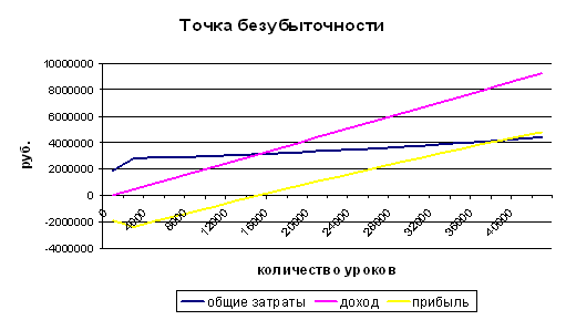 Таким образом, наиболее опасными для школы ООО «Скрипичный ключ» являются финансовые риски и рыночные риски. Оценка риска Точка безубыточности — минимальный объем производства и реализации продукции, при котором расходы будут компенсированы доходами, а при производстве и реализации каждой последующей единицы продукции предприятие начинает получать прибыль. Точку безубыточности можно определить в единицах продукции, в денежном выражении или с учётом ожидаемого размера прибыли. Точка безубыточности позволяет определить, после какого уровня продаж обеспечивается их рентабельность. Определение точки безубыточности с использованием маржинального дохода представляет собой альтернативу математическому методу. Маржинальный метод основывается на определении разности между выручкой от реализации и переменными затратами. Следовательно, в состав маржинального дохода входят прибыль и постоянные затраты. Точка безубыточности будет достигнута в том случае, когда предприятие получит доход, достаточный для покрытия постоянных затрат. Маржинальный доход = цена единицы продукции - переменные затраты Переменные затраты на единицу продукции при полной загруженности школы составят – 61158/600 = 101,93 руб., где 600 –количество учеников в школе с 2013 г. Средняя цена единицы продукции составит 220руб. Маржинальный доход на единицу продукции = 220 – 101,93 = 118,07 руб., Формула точки безубыточности: Точка безубыточности = суммарные постоянные затраты/ маржинальный доход на единицу продукции. Точка безубыточности = 1889236/118,07 = 16000 занятий