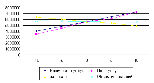 Рис. 2 Анализ чувствительности проекта На основе полученных данных построим график чувствительности от проекта от перечисленных факторов. Наиболее чувствителен данный проект к изменению количества услуг, при этом колебания NPV - наибольшее. При изменении цены также наблюдается изменении NPV. Таким образом, наиболее высокую чувствительность проект имеет к изменению следующих переменных: количество услуг и цена услуг. Проект имеет среднюю чувствительность к изменению такого показателя как зарплата и менее чувствителен к изменению объема инвестиций (за счет увеличения заемных средств). Для снижения возможных рисков, необходимо регулярно проводить анализ по количеству предоставляемых услуг, определять точное количество учащихся. Для регулярного притока учащихся в музыкальную школу необходимо проводить регулярно рекламную кампанию. Заключение Бизнес-план – краткое, точное, доступное описание предполагаемого бизнеса. По своему содержанию и назначению представляет собой плановый документ, имеющий многоцелевой характер: • разрабатывается для обоснования нового дела (в нем даются все основные аспекты будущей деятельности, анализируются проблемы, с которыми придется столкнуться, определяются способы их решения); • может служить формальным юридическим документом, с помощью которого начинается формирование уставного капитала и финансовых активов будущего предприятия; • используется как средство получения необходимых инвестиций; • является рекламой предполагаемого бизнеса. В данной работе были проведены исследования и получены выводы по соответствующим задачам, поставленным в начале работы. Целью работы является разработка бизнес-плана частной музыкальной школы. В первой главе определено понятие, сущность, структура бизнес-плана, его место в системе планирования; изучены современные методики и стандарты разработки бизнес-планов в России. Кроме того, были рассмотрены основные подходы и методы оценки эффективности и рисков проекта. Во второй главе разработан бизнес-план создания частной музыкальной школы ООО «Скрипичный ключ». Цель проекта – организация частной музыкальной школы, которая будет оказывать следующие услуги: обучение игре на фортепиано, скрипке, ксилофоне, гитаре, уроки вокала, сольфеджио и музыкальной литературы. Особенностью ООО «Скрипичный ключ» является то, что школа предлагает уроки музыки как для детей (с 5 лет), так и для взрослых, гарантирует индивидуальный подход каждому. В рамках школы будут проводиться музыкально-образовательные занятия, цель которых - развитие творческого начала, самостоятельности, способности быть деятельным, активным, устремленным, эмоционально развитым, цельным и гармоничным. Для реализации проекта будет снято помещение, общей площадью 283кв.м. Конкурентные преимущества ООО «Скрипичный ключ»: - частная музыкальная школа «Скрипичный ключ» представляет услуги самого высокого уровня, качество которых обеспечивается опытом, знанием и культурой преподавателей; - организация учебного процесса с использованием уникальной современной концепции и методики обучения музыке Н.А. Бергер; - ООО «Скрипичный ключ» расположен в центре г. Перми; - детям и взрослым во время пребывания в школе обеспечивается надежный уровень безопасности; Проведенный анализ показал, что основны