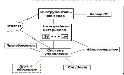 Рис. 1. Укрупненная структура АОС Обычно конкретные реализации АОС создаются определенными компаниями или университетами. Ресурсы таких АОС зачастую не являются мобильными, т.е. переносимыми для использования и развития из одной системы в другую. Это является очевидным недостатком с точки зрения создания интегрированной базы научно-образовательных ресурсов и применения в системах открытого образования. Система управления АОС имеет подсистемы, ориентированные на обучаемых, преподавателей и администраторов, контролирующих функционирование аппаратно-программных средств системы. Автоматизированная обучающая система контролирует права доступа пользователей; осуществляет поиск требуемых материалов, извлекает их из БУМ и предоставляет пользователю; обеспечивает доступ к индивидуальной рабочей тетради, содержащей график учебных занятий, результаты выполнения учебных заданий и другие заметки пользователя, связанные с изучением курса; реализует телекоммуникационные связи "преподаватель-обучаемый", "студент-лаборатория" и "обучаемый-обучаемый" и связи пользователей с Internet для поиска информации, организации конференций и совместной работы над проектами; помогает администратору поддерживать систему в актуальном состоянии, вести учет пользователей и др. Кроме того, в ряде АОС на систему управления возлагается выполнение функций электронного деканата таких, как учет обучаемых и их успеваемости, формирование расписаний конференций, консультаций и т.п. В настоящее время системы управления АОС создаются на основе технологий порталов и мультиагентных систем. В системах открытого образования и ДО целесообразно создание среды, потенциально способной интегрировать ресурсы различных АОС. Такую среду называют информационно-образовательной средой (ИОС) открытого образования. Собственно ИОС, как объединение многих АОС, можно рассматривать как интегрированную АОС. Существует и другой взгляд на ИОС, как только на систему управления взаимодействием различных АОС. При этом используют также другие названия ИОС, например Learning Management System (LMS), Training Management System (TMS), система управления учебным процессом. Очевидно, что создание ИОС возможно при наличии договоренностей образовательного сообщества о структурах учебных материалов и об интерфейсах АОС (метаданных), выраженных в форме стандартов. 4. Электронный учебник Полнофункциональный электронный учебник (ЭУ) состоит из нескольких основных частей (рис. 1), к которым относятся: · главная часть, в которой излагается содержание предмета, представленная в виде гипертекста с графическими иллюстрациями и, возможно, с аудио- и видеофрагментами; · тестирующая часть, включающая контрольные вопросы, упражнения и задания для практического освоения материала и самотестирования вместе с рекомендациями и примерами выполнения заданий; · толковый словарь; · часто задаваемые вопросы и подготовленные ответы на них; · описания лабораторных работ, если в учебной программе такие работы предусмотрены, включая оригинальное программное обеспечение для выполнения этих работ.