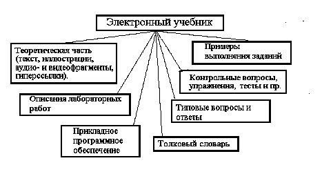 Рис. 1. Структура полнофункционального электронного учебника Главная часть ЭУ обычно или представляется в виде совокупности лекций (уроков), или структурируется с выделением разделов, глав, параграфов аналогично построению книг традиционной формы. Возможно также модульное построение ЭУ с возможностями оперативной компиляции текста ЭУ из набора имеющихся модулей, что реализуется в интерактивных электронных технических руководствах (ИЭТР) и в электронных прикладных энциклопедиях. Тестирующая часть может быть или сконцентрирована в виде задачника, или распределена по разделам и главам основного текста, или выражена в совокупности тестирующих модулей. Толковый словарь состоит из терминов в форме гиперссылок на соответствующие места основной части и кратких определений этих терминов (иногда определения могут отсутствовать). Возможны три способа организации лабораторных работ. Первый из них является традиционным, он основан на использовании реального (физического) лабораторного оборудования, расположенного в учебном центре с явкой обучаемых в этот центр. Для этого в учебных планах и расписаниях лиц, обучаемых по дистанционным технологиям, должны быть выделены специальные сессии. Второй способ также основан на использовании физического оборудования, но с дистанционным доступом к нему с помощью телекоммуникационных технологий и специальных программно-аппаратных средств. Третий способ подразумевает выполнение экспериментов на ЭВМ в виртуальных лабораториях с использованием математических моделей, реализованных в соответствующем программном обеспечении. В описания лабораторных работ должны быть включены, кроме необходимого теоретического материала или ссылок на него, также контрольные вопросы, сведения об используемом оборудовании и программно-аппаратном обеспечении, задание и форма представления результатов. К электронным учебным материалам предъявляются как традиционные, так и специфические требования, порождаемые возможностями информационных технологий. Среди основных характеристик учебных материалов, к которым предъявляются традиционные требования, выделяют следующие свойства: · полнота изложения, определяемая как соответствие принятой учебной программе дисциплины; · доступность изложения материала, соотносимая с уровнем предварительной подготовки контингента обучаемых, для которых материал предназначен; · научность содержания, отражающая соответствие содержания современному состоянию и последним достижениям в соответствующей научной области; · логичность и последовательность изложения материала. В своей совокупности первые три свойства определяют адекватность учебного материала целям его создания, т.е. адекватность отражает взвешенное компромиссное удовлетворение требований полноты, доступности и научности. Традиционность названных свойств не означает одинаковости степени их удовлетворения в традиционных и компьютерных технологиях обучения. Так, возможность сравнительно легкого обновления учебных материалов позволяет обеспечивать более высокую степень актуальности и отражения современного состояния предметных областей в ЭУ по сравнению с традиционными печатными изданиями. Модульная структура ЭУ способствует оптимизации последовательности изложения материала. Сп