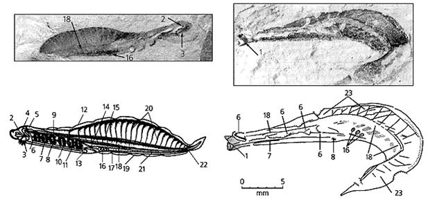 Фоссилизированные остатки (верхний ряд) и реконструкции хайкоуэллы (слева) и юннанозоона. Это самые древние хордовые из когда-либо и где-либо найденных. 1 - передний конец тела, 2 - глаз, 3 - ротовая полость, 4 -передний жаберный сосуд, 5 - мозг, 6 - жаберные щели, 7 - эндостиль, 8 - зубовидные структуры, 9 - спинная аорта, 10 - глотка, 11 - брюшная аорта, 12 - спинной плавник, 13 - сердце, 14 - пищевод, 15 - нервный тяж, 16 - половые железы, 17 - желудок, 18 - хорда, 19 - брюшной плавник, 20 - миосепты, 21 - кишка, 22 - анальное отверстие, 23 - миомеры. Тело хайкоуэллы было ланцетовидным, длиной 25-40 мм, отчетливо выделялись голова, туловище и хвост. Брюшная часть туловища утолщена, спинная сжата с боков. Имелись плавники: невысокий спинной и небольшие брюшной и хвостовой. По бокам головы расположена пара округлых структур, которые китайские палеонтологи интерпретировали как глаза. На брюшной стороне головы находилось ротовое отверстие, окруженное небольшими щупальцами и ведущее в объемистую глотку, боковые стенки которой пронизывались жаберными щелями и укреплялись шестью парами жаберных дуг. В глотке имелись конические зубовидные выросты, а по ее дну тянулся желобок - эндостиль, - признак, характерный для всех хордовых. Глотка переходила в узкий пищевод, соединявшийся с извитой средней кишкой, за ней следовала прямая задняя, которая заканчивалась анальным отверстием на брюшной стороне тела, у основания хвоста. Над кишечником хайкоуэллы лежала хорда (осевой скелет), в туловище утолщенная и смещенная в нижнюю часть тела. Над ней располагался продольный нервный тяж, который в голове образовывал мозг из трех отделов. Под глоткой и над ней также находились тяжи, но китайские палеонтологи интерпретировали их как главные кровеносные сосуды - брюшную и спинную аорты. Их связывали жаберные артерии, а сама брюшная аорта начиналась от похожего на пузырь вздутия, которое могло быть сердцем. У хайкоуэллы спинную часть туловища над хордой занимали метамерные мышцы, сегменты которых (миомеры) разделялись S-образными перегородками - септами. По бокам средней кишки находились половые железы: четыре пары у хайкоуэллы и 13 пар у юннанозоона. По всем важнейшим диагностическим признакам - общему плану строения тела, наличию хорды, центральной нервной системы в виде продольной трубки, глотки с жаберными щелями - хайкоуэлла и юннанозоон относятся к хордовым животным. До находок в Китае столь древние представители хордовых не были известны, и проблему их происхождения многие поколения ученых пытались решить умозрительно. Интересно, что строение хайкоуэллы и юннанозоона оказалось очень близким к типу организации гипотетического общего предка хордовых, который был обоснован в 1925 г. А.Н.Северцовым и назван им примитивным бесчерепным (Acrania primitiva). Хайкоуэлла отличается от него такими признаками более высокой организации, как обособленная голова, в которой отсутствуют мышечные сегменты-миомеры, головной мозг, парные глаза, сердце. Все это сближает хайкоуэллу с предками высших хордовых - позвоночных. Полученные китайскими палеонтологами данные соответствуют