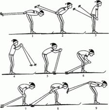 Очень важно во время передвижения на лыжах своевременно перейти на этот ход (если есть соответствующие условия), так как по сравнению с другими ходами скорость передвижения выше, а также в связи с достаточной экономичностью хода. Скорость передвижения при данном способе поддерживается только за счет одновременных толчков палками, скольжение происходит все время на двух лыжах, поэтому основная нагрузка падает на мышцы рук и туловища (мышцам нижних конечностей предоставляется относительный отдых). Бесшажный ход выполняется следующим образом: 1. После окончания толчка руками лыжник скользит, согнувшись на двух лыжах, голова чуть приподнята. 2-3. Продолжается скольжение, лыжник медленно выпрямляется и легким маятникообразным движением выносит палки вперед. 4. Лыжник почти полностью выпрямляется, начинается подготовка к отталкиванию - масса тела перемещается на носки, ноги слегка сгибаются, палки выведены вперед перед постановкой на снег. 5. Палки ставятся на снег чуть впереди креплений, начинается толчок руками. 6. Основное усилие на палки развивается за счет сгибания туловища. Угол сгибания рук в локтевых суставах несколько уменьшается. 7-8. Толчок заканчивается полным разгибанием рук. Кисти рук находятся на уровне не выше колен, угол наклона палок наибольший. 9. После окончания толчка лыжник по инерции скользит, согнувшись, на двух лыжах. Цикл движений повторяется Техника бесшажного хода довольно проста, и обучение проводится целостным методом. Однако перед началом передвижения по лыжне целесообразно проимитировать движение (наклон туловища, отталкивание руками и медленное выпрямление) без палок, стоя на месте. При объяснении следует обратить особое внимание военнослужащих на медленное выпрямление туловища при прокате, расслабленный, маятникообразный вынос рук вперед и постановку палок на снег под углом около креплений. Это позволяет сразу начать эффективное отталкивание. Палки ставятся на снег активным движением, почти «ударом». Очень важно сразу создать жесткую систему передачи усилия отталкивания на скользящие лыжи (руки - туловище - ноги - лыжи). Толчок начинается с наклона туловища («навала») на палки и заканчивается резким выпрямлением рук. В то же время ноги в коленях слегка согнуты и жестко «закреплены» - сгибание или разгибание ног приводит к уменьшению силы отталкивания. Обучение этому ходу удобно проводить на ровном пологом склоне с длинным прямым выкатом. Набрав скорость на спуске, обучаемые продолжают движение по равнине, пытаясь как можно дольше поддержать ее за счет одновременных толчков палками. Попытка приводит к снижению скорости, а это недопустимо, так как требуется больше сил при следующем толчке. Таким образом, каждое отталкивание важно начинать, не дожидаясь уменьшения скорости. Обучение этому ходу в плохих условиях скольжения проводить нецелесообразно. Отдельные обучаемые в связи с недостаточным уровнем развития силы мышц плечевого пояса не в состоянии выполнить в таких условиях полноценный толчок. В этом случае все их внимание будет сосредоточено на силе отталкивания, а не на правильной технике движения, что затрудняет обучение. Единственный правильный выход - проводить обучение под уклон на хорошо подготовленной лыжне с твердой опорой на палки. Величина уклона зависит от условий скольж