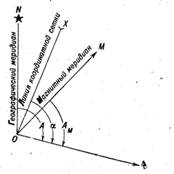 Рис.1 Магнитное склонение. Переход от магнитного азимута к геодезическому азимуту. Свойство магнитной стрелки занимать определенное положение в данной точке пространства обусловлено взаимодействием ее магнитного поля с магнитным полем Земли. Направление установившейся магнитной стрелки в горизонтальной плоскости соответствует направлению магнитного меридиана в данной точке. Магнитный меридиан в общем случае не совпадает с геодезическим меридианом. Угол между геодезическим меридианом данной точки и ее магнитным меридианом, направленным на север, называется склонением магнитной стрелки или магнитным склонением. Магнитное склонение считается положительным, если северный конец магнитной стрелки отклонен к востоку от геодезического меридиана (восточное склонение), и отрицательным, если он отклонен к западу (западное склонение). Зависимость между геодезическим азимутом, магнитным азимутом и магнитным склонением (рис.2) может быть выражена формулой: