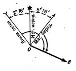 Рис.2 Магнитное склонение изменяется с течением времени и переменой места. Изменения бывают постоянные и случайные. Эту особенность магнитного склонения необходимо учитывать при точном определении магнитных азимутов направлений, например, при наводке орудий и пусковых установок, ориентировании с помощью буссоли технических средств разведки, подготовке данных для работы с навигационной аппаратурой, движении по азимутам. Изменения магнитного склонения обусловлены свойствами . магнитного поля Земли. Переход от магнитного азимута к дирекционному углу. На местности при помощи компаса (буссоли) измеряют магнитные азимуты направлений, от которых затем переходят к дирекционным углам; На карте, наоборот, измеряют дирекционные углы и от них переходят к магнитным азимутам направлений на местности. Для решения этих задач необходимо знать величину отклонения магнитного меридиана в данной точке от вертикальной линии координатной сетки карты. Угол, образованный вертикальной линией координатной сетки и магнитным меридианом, представляющий собой сумму сближения меридианов и магнитного склонения, называется отклонением магнитной стрелки или поправкой направления (ПН). Он отсчитывается от северного направления вертикальной линии координатной сетки и считается положительным, если северный конец магнитной стрелки отклоняется к востоку от этой линии, и отрицательным при западном отклонении магнитной стрелки: На рис.3 поправка направления равна 2°16' +5*16'= +7°32'. Поправку направления и составляющие ее сближение меридианов и магнитное склонение приводят на карте под южной стороной рамки в виде схемы с пояснительным текстом. Поправку направления в общем случае можно выразить формулой: