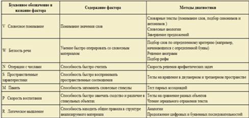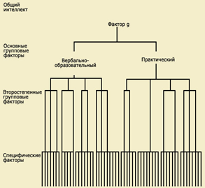 Рисунок 4. Пример задания одного из тестов Дж. Гилфорда Иерархические теории интеллекта. К началу 50-х годов появляются работы, в которых предлагается рассматривать различные интеллектуальные характеристики как иерархически организованные структуры. В 1949 г. английский исследователь Сирил Берт [4] опубликовал теоретическую схему, согласно которой в структуре интеллекта существует 5 уровней. Низший уровень образуют элементарные сенсорные и моторные процессы. Более общим (вторым) уровнем являются перцепция и моторная координация. Третий уровень представлен процессами выработки навыков и памятью. Еще более общим уровнем (четвертым) являются процессы, связанные с логическим обобщением. Наконец, пятый уровень образует общий фактор интеллекта (g). Схема С. Берта, практически, не получила экспериментальной проверки, но это была первая попытка создать иерархическую структуру интеллектуальных характеристик. Работа другого английского исследователя, Филипа Вернона [5], появившаяся в то же время (1950 г.), имела подтверждения, полученные в факторно - аналитических исследованиях. Ф. Вернон выделил четыре уровня в структуре интеллектуальных характеристик - общий интеллект, основные групповые факторы, второстепенные групповые факторы и специфические факторы. Все эти уровни изображены на рисунке 5. Общий интеллект, согласно схеме Ф. Вернона, подразделяется на два фактора. Один из них связан с вербальными и математическими способностями и зависит от образования. Второй - испытывает меньшее влияние образования и относится к пространственным и техническим способностям и к практическим навыкам. Эти факторы, в свою очередь, подразделяются на менее общие характеристики, аналогичные первичным умственным способностям Л. Терстона [2], а наименее общий уровень образуют особенности, связанные с выполнением конкретных тестов. Наиболее известную в современной психологии иерархическую структуру интеллекта предложил американский исследователь Раймонд Кэттел [6]. Р. Кэттел и его коллеги предположили, что отдельные интеллектуальные характеристики, выделенные на основе факторного анализа (такие, как первичные умственные способности Л. Терстона [2] или независимые факторы Дж. Гилфорда [3]), при вторичной факторизации объединятся в две группы или, в терминологии авторов, в два широких фактора. Один из них, названный кристаллизованным интеллектом, связан с теми знаниями и навыками, которые приобретены человеком – «кристаллизованы» в процессе обучения. Второй широкий фактор - флюидный интеллект - меньше связан с обучением и больше - со способностью адаптироваться к незнакомым ситуациям. Чем выше флюидный интеллект, тем легче человек справляется с новыми, непривычными для него проблемными ситуациями.