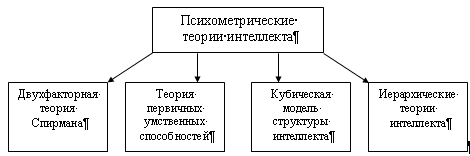 Рисунок 1. Психометрические теории личности Рассмотрим каждую из этих теорий в отдельности. Двухфакторная теория интеллекта Ч. Спирмана [1]. Первая работа, в которой была предпринята попытка проанализировать структуру свойств интеллекта, появилась в 1904 г. Ее автор, Чарльз Спирман, английский статистик и психолог, создатель факторного анализа, он обратил внимание на то, что между разными интеллектуальными тестами существуют корреляции: тот, кто хорошо выполняет одни тесты оказывается, в среднем, довольно успешным и в других. Для того, чтобы понять причину этих корреляций, Ч. Спирман разработал специальную статистическую процедуру, позволяющую объединить коррелирующие показатели интеллекта и определить то минимальное количество интеллектуальных характеристик, которое необходимо для того, чтобы объяснить связи между разными тестами. Эта процедура была, как мы уже упоминали, названа факторным анализом, различные модификации которого активно применяются в современной психологии. Проведя факторизацию разных тестов интеллекта, Ч. Спирман пришел к выводу, что корреляции между тестами являются следствием общего фактора, лежащего в их основе. Этот фактор он назвал «фактор g» (от слова general - общий). Общий фактор имеет решающее значение для уровня интеллекта: согласно представлениям Ч. Спирмана [1], люди различаются, главным образом, по тому, в какой степени они обладают фактором g. Кроме общего фактора, есть еще и специфические, определяющие успешность выполнения разных конкретных тестов. Так, выполнение пространственных тестов зависит от фактора g и пространственных способностей, математических тестов - от фактора g и математических способностей. Чем больше влияние фактора g, тем выше корреляции между тестами; чем больше влияние специфических факторов, тем меньше оказывается связь между тестами. Влияние специфических факторов на индивидуальные различия между людьми, как считал Ч. Спирман [1], имеет ограниченное значение, поскольку они проявляются далеко не во всех ситуациях, и поэтому на них не стоит ориентироваться при создании интеллектуальных тестов. Таким образом, структура интеллектуальных свойств, предложенная Ч. Спирманом, оказывается чрезвычайно простой и описывается двумя видами факторов - общим и специфическими. Эти два вида факторов и дали название теории Ч. Спирмана - двухфакторная теория интеллекта. В более поздней редакции этой теории, появившейся в середине 20-х годов, Ч. Спирман признал существование связей между некоторыми интеллектуальными тестами. Эти связи невозможно было объяснить ни фактором g, ни специфическими способностями, и поэтому Ч. Спирман ввел для объяснения этих связей, так называемые, групповые факторы - более общие, чем специфические, и менее общие, чем фактор g. Однако при этом основной постулат теории Ч. Спирмана остался неизменным: индивидуальные различия между людьми по интеллектуальным характеристикам определяются преимущественно общими способностями, т.е. фактором g. Но недостаточно выделить фактор математически: необходимо еще попытаться понять его психологический смысл. Для объяснения содержания общего фактора Ч. Спирман высказал два предположения. Во-первых, фактор g определяет уровень «умственной энергии», необходимой для решения разных интеллектуальных задач. Этот уровень не о