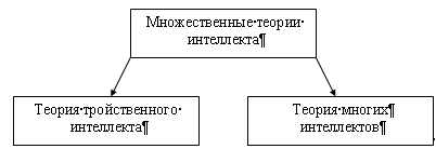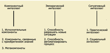 Рисунок 6. Множественные теории интеллекта Рассмотрим каждую теорию в отдельности. Теория тройственного интеллекта. Автор этой теории, американский исследователь Роберт Стернберг [10], считает, что целостная теория интеллекта должна описывать три его аспекта - внутренние компоненты, связанные с обработкой информации (компонентный интеллект), эффективность овладения новой ситуацией (эмпирический интеллект) и проявление интеллекта в социальной ситуации (ситуативный интеллект). На рисунке 7 представлена схема, демонстрирующая три вида интеллекта, выделяемые Р. Стернбергом [10]. В компонентном интеллекте Р. Стернберг выделяет три вида процессов или компонентов. Исполнительские компоненты представляют собой процессы восприятия информации, сохранения ее в кратковременной памяти и извлечения информации из долговременной памяти; они связаны также со счетом и со сравнением объектов. Компоненты, связанные с приобретением знаний, обусловливают процессы получения новой информации и ее сохранения. Метакомпоненты контролируют исполнительские компоненты и приобретение знаний; они также определяют стратегии решения проблемных ситуаций. Как показали исследования Р. Стернберга, успешность решения интеллектуальных задач зависит, прежде всего, от адекватности используемых компонентов, а не от скорости обработки информации. Часто более успешное решение оказывается связанным с большими затратами времени.