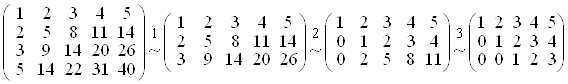 ранг матриці Розв’язання. Насамперед відзначимо, що четвертий рядок матриці є сумою другого і третього рядків і тому при вилученні цього рядка ранг матриці не зміниться. 1.Відкинемо четвертий рядок. 2.З другого і третього рядків матриці віднімемо перший рядок, помножений, відповідно, на 2 та 3. 3.В отриманій матриці з третього рядка віднімемо другий, помножений на 2. Одержимо ланцюжок перетворень: лінійний рівняння матриця