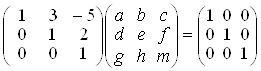 За допомогою операцій над рядками матриці А¢ утворимо на місці (–Е) нульову матрицю. Тоді в правому нижньому куті буде стояти матриця А–1. 1.До всіх рядків матриці А¢ додамо третій рядок з деяким множником, домагаючись того, щоб всі елементи першого стовпця, крім а31, дорівнювали нулю. 2.Перший рядок отриманої матриці поділимо на (–3) і, додаючи до інших рядків матриці отриманий перший рядок з деякими множниками, досягаємо того, щоб у другому стовпці стояли нулі, крім елемента а12. 3.За допомогою другого рядка утворимо нулі в третьому стовпці, крім елемента а23. Одержимо ланцюжок перетворень:
