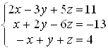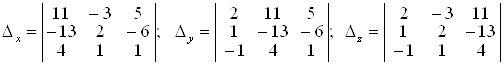 матриця системи має вигляд: Розв’язок системи може бути знайдений за правилом Крамера, тому що detА = D = 18 ¹ 0. Для цього побудуємо визначники Dх, Dу, Dz, які відрізняються від головного визначника тим, що в ньому стовпець коефіцієнтів при, відповідно, х, у та z замінено на стовпець вільних членів, тобто: