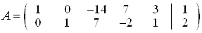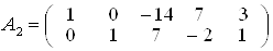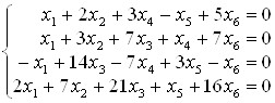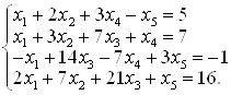 Звідси х1 = 14х3 – 7х4 – 3х5, х2 = – 7х3 + 2х4 – х5, де х3, х4, х5 – будь-які. Даючи вільним змінним х3, х4, х5 значення: а) 1, 0, 0; б) 0,1,0; в) 0, 0, 1; одержимо, відповідно, базисні вектори простору L розв’язків однорідної системи рівнянь: е1 = (14, –7, 1, 0, 0), е2 = (–7, 2, 0, 1, 0), е3 = (–3, –1, 0, 0, 1). Отже, розв’язки вихідної системи утворюють лінійний многовид М: M = {x ½x = f + c1e1 + c2e2 + c3e3}, де c1, c2, c3 – будь-які, |