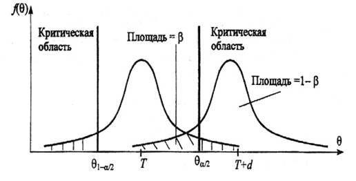 Рис. 1.1. Области принятия и отклонения гипотезы Предположим, что истинное значение оцениваемого параметра равно Т. Если рассматривать гипотезу Н0 о равенстве q=Т, то насколько велико должно быть различие между q и Т, чтобы эту гипотезу отвергнуть. Ответить на данный вопрос можно в статистическом смысле, рассматривая вероятность достижения некоторой заданной разности между q и Т на основе выборочного распределения параметра q. Целесообразно полагать одинаковыми значения вероятности выхода параметра q за нижний и верхний пределы интервала. Такое допущение во многих случаях позволяет минимизировать доверительный интервал, т.е. повысить мощность критерия проверки. Суммарная вероятность выхода параметра q за пределы интервала с границами q1–a/2 и qa/2, составляет величину a. Эту величину следует выбрать настолько малой, чтобы выход за пределы интервала был маловероятен. Если оценка параметра попала в заданный интервал, то в таком случае нет оснований подвергать сомнению проверяемую гипотезу, следовательно, гипотезу равенства q=Т можно принять. Но если после получения выборки окажется, что оценка выходит за установленные пределы, то в этом случае есть серьезные основания отвергнуть гипотезу Н0. Отсюда следует, что вероятность допустить ошибку первого рода равна a (равна уровню значимости критерия). Если предположить, например, что истинное значение параметра в действительности равно Т+d , то согласно гипотезе Н0 о равенстве q=Т – вероятность того, что оценка параметра q попадет в область принятия гипотезы, составит b, рис. 1.2.