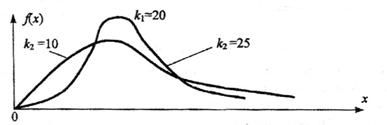 где х=c2, Г(k/2) – гамма-функция. Число степеней свободы k определяет количество независимых слагаемых в выражении для c2. Функция плотности при k, равном одному или двум, – монотонная, а при k>2 – унимодальная, несимметричная, рис. 1.6.