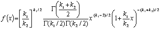 х=[(y1/k1)/(y2/k2)], равная отношению двух случайных величин у1 и у2, имеющих хи-квадрат распределение с k1 и k2 степенями свободы. Область изменения аргумента х от 0 до бесконечности. Плотность распределения