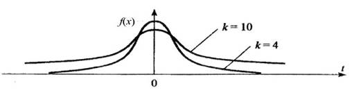 Рис. 1.7. Плотность распределения Стьюдента Область изменения аргумента t от минус до плюс бесконечности. Математическое ожидание и дисперсия равны 0 и k/(k–2) соответственно, при k>2. По сравнению с нормальным распределение Стьюдента более пологое, оно имеет меньшую дисперсию. Это отличие заметно при небольших значениях k, что следует учитывать при проверке статистических гипотез (критические значения аргумента распределения Стьюдента превышают аналогичные показатели нормального распределения). Таблицы распределения содержат значения для односторонней (пределы интегрирования от r(k; a ) до бесконечности)