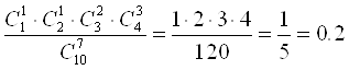 P(A) = Задача № 3 Имеются изделия четырех сортов, причем число изделий первого сорта – 1, второго сорта - 2, третьего сорта - 3, четвертого сорта - 4. Для контроля наудачу берут 7 изделий. Определить вероятность того, что среди них одно изделие первосортное, одно - второго сорта, два - третьего и три - четвертого сорта. Решение: