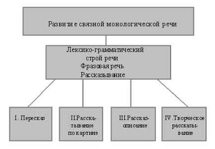 Курсовая работа: Теоретико-методологический анализ формирования навыков связной монологической речи у детей с общим недоразвитием речи III уровняКурсовая работа: Теоретико-методологический анализ формирования навыков связной монологической речи у детей с общим недоразвитием речи III уровняМИНИСТЕРСТВО ОБРАЗОВАНИЯ РОССИЙСКОЙ ФЕДЕРАЦИИ ГОСУДАРСТВЕННОЕ ОБРАЗОВАТЕЛЬНОЕ УЧРЕЖДЕНИЕ ВЫСШЕГО ПРОФЕССИОНАЛЬНОГО ОБРАЗОВАНИЯ ТЮМЕНСКИЙ ГОСУДАРСТВЕННЫЙ УНИВЕРСИТЕТ ИНСТИТУТ ПСИХОЛОГИИ, ПЕДАГОГИКИ, СОЦИАЛЬНОГО УПРАВЛЕНИЯ КАФЕДРА СПЕЦИАЛЬНОЙ ПЕДАГОГИКИ Теоретико-методологический анализ формирования навыков связной монологической речи у детей с ОНР III уровня Студентки 3 курса ОЗО группы 2985 по специальности 050715.65-"Логопедия" Лыжиной Н.В. Научный руководитель: к. пед. н., доцент кафедры специальной педагогики, Дмитриева Л.И. Содержание Введение 1.1 Развитие связной речи в онтогенезе 1.2 Психологические и лингвистические характеристики связной речи 1.3 Характеристика общего недоразвития речи. Периодизация ОНР Глава II. Констатирующий эксперимент и его анализ 2.2 Анализ результатов исследования связной монологической речи у старших дошкольников с ОНР 3.1 Теоретические основы формирующего эксперимента 3.2 Контрольный эксперимент и его анализ Список литературы Введение Актуальность. Одной из главных задач воспитания и обучения детей дошкольного возраста является развитие речи, речевого общения. Владение родным языком - это не только умение правильно построить предложение. Ребенок должен научиться рассказывать: не просто называть предмет, но и описать его, рассказать о каком-то событии, явлении, о последовательности событий. Такой рассказ должен состоять из ряда предложений и характеризовать существенные стороны и свойства описываемого предмета, события должны быть последовательными и логически связанными друг с другом, то есть речь ребенка должна быть связной. Связная речь представляет собой наиболее сложную форму речевой деятельности. Она носит характер последовательного систематического развернутого изложения. В формировании связной речи отчетливо выступает тесная связь речевого и умственного развития детей, развития их мышления, восприятия, наблюдательности. Чтобы связно рассказать о чем-нибудь, нужно ясно представлять себе объект рассказа (предмет, событие), уметь анализировать, отбирать основные (для данной ситуации общения) свойства и качества, устанавливать причинно-следственные, временные и другие отношения между предметами и явлениями. Для достижения связности речи необходимо также умело использовать интонацию, логическое (фразовое) ударение, подбирать подходящие для выражения данной мысли слова, уметь строить сложные предложения, использовать языковые средства для связи предложений. У детей с нормой речевого развития в старшем дошкольном возрасте связная речь достигает довольно высокого уровня. Это очень важно для дальнейшего успешного обучения в школе, для всестороннего развития личности ребенка. общее недоразвитие речь ребенок Психолого-педагогические исследования в коррекционной педагогике показывают, что в настоящее время наблюдается устойчивая тенденция к увеличению числа детей с нарушениями речевого развития. Среди них велика категория детей с ОНР - общим недоразвитием речи. При общем недораз