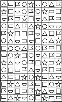 Модификация таблиц Шульте (буквенный вариант). Анализ результатов: Сравнивается время работы по каждой из таблиц. Норма - 30-50 сек на 1 таблицу. Средняя норма - 40-42 сек. В норме на каждую из таблиц уходит примерно одинаковое время. Методика изучения концентрации и устойчивости внимания (модификация метода Пьерона - Рузера).[31] Инструкция: "Закодируйте таблицу, расставив в ней знаки по образцу".