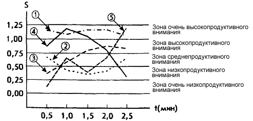 S=(0.5N-2.8n)/t; · S – показатель продуктивности и устойчивости внимания обследованного ребенка; · N – количество изображений предметов на рисунках, просмотренных ребенком за время работы; · t – время работы; · n – количество ошибок, допущенных за время работы. Ошибками считаются пропущенные нужные или зачеркнутые ненужные изображения. В итоге количественной обработки психодиагностических данных определяются по приведенной выше формуле шесть показателей, один – для всего времени работы над методикой (2,5 мин), а остальные – для каждого 30-секундного интервала. Соответственно, переменная t в методике будет принимать значение 150 и 30. По всем показателям S, полученным в процессе выполнения задания, строится график, на основе анализа которого можно судить о динамике изменения во времени продуктивности и устойчивости внимания ребенка. При построении графика показатели продуктивности и устойчивости переводятся (каждый в отдельности) в баллы по десятибалльной системе следующим образом: · 10 баллов – показатель S у ребенка выше, чем 1,25 балла. · 8-9 баллов – показатель S находится в пределах от 1,00 до 1,25 балла · 6-7 баллов – показатель S находится в интервале от 0,75 до 1,00 балла · 4-5 баллов – показатель S находится в границах от 0,50 до 0,75 балла. · 2-3 балла – показатель S находится в пределах от 0,24 до 0,50 балла. · 0-1 балл – показатель S находится в интервале от 0,00 до 0,2 балла.