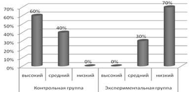В процентном соотношении уровни развития детей в контрольной и экспериментальной группах представлено в таблице 3. Из таблицы видно, что разница в обеих группах значительная, в контрольной группе уровень понимания антонимов на 40% выше. Наглядно это представлено в виде диаграммы (диаграмма 1