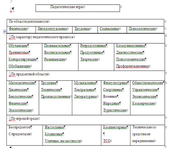 По содержанию игры с готовыми правилами различают: все предметные, спортивные, подвижные, интеллектуальные, строительные и технические, музыкальные (ритмические, хороводные, танцевальные), лечебные, коррекционные, шуточные, ритуально-обрядовые и т.д. «Вольные» игры различают по той сфере жизни, которые они отражают: военные, свадебные, театральные, художественные, бытовые игры в профессию, и этнографические. Различают игры с предметами и без предметов, настольные, комнатные, уличные, на местности, компьютерные и с ТСО, а также с разными средствами передвижения. Форма – способ существования и выражение содержания. По форме выделяют самостоятельные типовые группы, в которых следующие игры: игры – празднества, игровые праздники; игровой фольклор; театральные игровые действия; игровые тренинги и упражнения; игровые анкеты, вопросники, тесты; эстрадные игровые импровизации; соревнования, состязания, противоборства, соперничества; конкурсы, эстафеты, старты; свадебные обряды, игровые обычаи; мистификации, розыгрыши, сюрпризы; карнавалы, маскарады; игровые аукционы и т.д. Педагогические игры обладают существенным признаком – четко поставленной целью обучения и соответствующим ей педагогическим результатам, учебно-познавательной направленностью. Активизировать познавательную деятельность учащихся позволяет игровая форма занятий, которая создаётся при помощи игровых приёмов и ситуаций. Дидактическая цель при планировании игры превращается в игровую задачу, учебная деятельность подчиняется правилам игры, учебный материал используется как средство для игры, в учебную деятельность вводится элемент соревнования, который переводит дидактическую задачу в игровую, а успешное выполнение дидактического задания связывается с игровым результатом. Важнейшая роль в игровых технологиях принадлежит заключительному ретроспективному (подробному) обсуждению, в котором учащиеся совместно анализируют ход и результаты игры, соотношение игровой модели и реальности, а также ход учебно-игрового взаимодействия. Развитию психологических качеств личности, эмоциональности и гибкости ума способствую игровые уроки. Привлечение учащихся к игре позволяет достичь эффекта раскрепощения, активного поиска, умения анализировать, принимать решения, общаться. В игровой увлекательной форме учащимся даётся тот материал, который в традиционной форме усваивается очень слабо и без интереса. Когда учащиеся увлекаются, они не замечают, что учатся – легко познают, запоминают новое, ориентируются в необычной ситуации. Рассмотрим некоторые особенности методических типов игр, принимаемых в образовательном процессе. Деловые игры – хорошая форма коллективного познания. Они моделируют реальную производственную деятельность. Учащиеся разбиваются на группы, которые получают своё задание. Возможные варианты структуры деловой игры на уроке. · Знакомство с реальной ситуацией; · Построение её имитационной модели; · Написание сценария; · Подбор необходимой информации, средств обучения, создающих игровую обстановку; · Уточнение целей проведения игры, составление руководства для ведущего, инструкций для игроков, дополнительный подбор и оформление дидактических материалов; · Разработка способов оценки результатов игры в целом и её участников в отдельнос