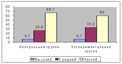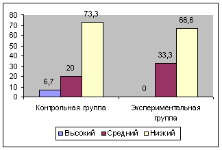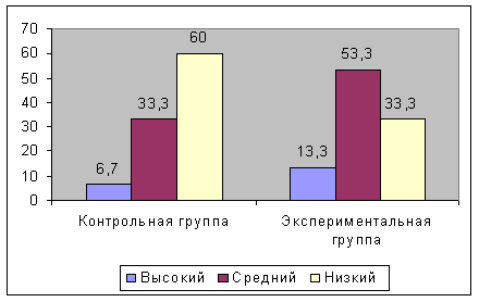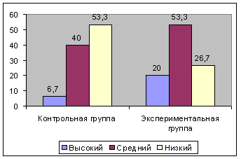 Диаг.3. Выявление уровня экологической культуры учащихся на стадии контрольного эксперимента по теме "Осенние изменения в жизни растений и животных". Таблица 4. Данные экспериментального изучения уровня сформированности экологических знаний в контрольном эксперименте.
