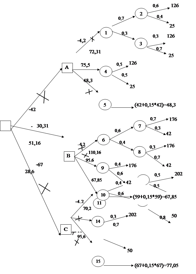 В результате ожидаемая прибыль для товаров за вычетом средств на их внедрение и разработку составила: для товара А - 30, 31 тыс. у.д.е.; для товара В - 51, 16 тыс. у.д.е.; для товара С – 28, 6 тыс. у.д.е. Было принято решение разрабатывать и выходить на рынок с товаром В, т.к. он принесет наибольшую прибыль. На первом этапе мы принимаем решение о проведении рекламной кампании или вложении денег в банк. Если мы кладем деньги в банк под 15%, то получим со 100% гарантией 67, 85 тыс. у.д.е. Если мы выбираем проводить рекламную кампанию, то сразу же отдаем 4, 2 тыс. у.д.е., при этом результаты могут быть как благоприятные, так и неблагоприятные. Вероятность благоприятного результата исследований 0, 6 и соответственно неблагоприятного 0, 4. При благоприятных результатах, у нас есть вероятность того, что рынок все же окажется не благоприятным, и она составит 0, 7 а вероятность благоприятного рынка 0, 3. При неблагоприятных результатах исследований вероятность благоприятного рынка 0, 3 неблагоприятного 0, 7. После реализации нашей продукции на благоприятном рынке ожидаемая прибыль составит 176 тыс. у.д.е., а на неблагоприятном –42 тыс. у.д.е. Что бы узнать реальную прибыль за вычетом издержек, идем в обратную сторону от конца к началу. Ожидаемая прибыль при благоприятных результатах исследований составит 81, 48 тыс. у.д.е., при неблагоприятных исследованиях 32, 88 тыс. у.д.е. Ожидаемая прибыль от обоих результатов составит 114, 36. Из данной суммы мы потратим 4, 2 тыс. у.д.е. на рекламную кампанию, так что при проведении рекламной кампании мы получим 110, 16 тыс. у.д.е. прибыли. Если мы выбираем не проводить рекламную кампанию, а сразу выходить на рынок со своей продукцией, то вероятность благоприятного 0, 3 и неблагоприятного 0, 7 рынков. Ожидаемая прибыль так же равна 176 тыс. у.д.е. и 42 тыс. у.д.е. соответственно. При расчете ожидаемой прибыли без затрат мы получаем 95, 6 тыс. у.д.е. Т.о., мы выбираем выведение товара В на рынок с проведением рекламной кампании. За вычетом стоимости разработки и внедрения ожидаемая прибыль составит 110.16 тыс. у.д.е. Т.к. наша компания специализируется на электронной наукоемкой продукции, остро стоит вопрос о точном соблюдении всех параметров работы произведенного оборудования на протяжении всего жизненного цикла товара. В конструкции нашей модели присутствует несколько блоков, которые могут при определенных факторах вывести ее из строя. Это может быть предотвращено введением БКК, который пока еще не разработан. Перед компанией стоит 2 альтернативы: разрабатывать БКК или положиться на качество товара. Для выбранного товара было предложено сформировать «дерево» решений по выбору политики обеспечения требуемых норм качества выпускаемой продукции, с учетом возможности разработки БКК (блока компьютерного контроля). Таблица 2 Вероятностные оценки характеристик факторов, обеспечивающих безопасность технологического процесса