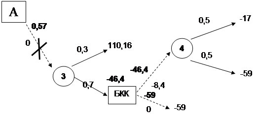 Рис. 2 - «Дерево решений» по выбору политики обеспечения требуемых норм качества Мы можем начать разработку БКК немедленно, затратив на это 8, 4 тыс. у.д.е., но при этом у нас есть два варианта развития событий, первый- то, что наша продукция удовлетворяет требуемому уровню качества, второй- деньги, затраченные на разработку БКК окажутся не потраченными. Если мы не зря поставили БКК и он пригодился, то вероятность безопасного процесса его работы составит 0, 5, но есть вероятность 0, 5, что БКК не оправдает надежд. В обратном случае, ожидаемая прибыль от установки БКК составит 59, 46 тыс. у.д.е. Если мы решим заняться выпуском БКК спустя год, нас могут опередить конкуренты. Если мы выпустим продукцию без БКК, то вероятность безопасного процесса 0, 3, при этом прибыль составит 110, 16 тыс. у.д.е. Вероятность опасного процесса 0, 7. Тогда мы начнём выпускать БКК, но может сложиться так, что невозможно создать безопасный процесс выпуска и работа над БКК окажется безуспешной, тогда мы потеряем 59 тыс. у.д.е. Или же мы начнём его разрабатывать, но вероятность безопасного процесса его работы будет 0, 5, и остается вероятность 0, 5, то что БКК не выполнит своей функции. В обратном случае, ожидаемая прибыль будет составлять 0, 57 тыс. у.д.е. По результатам исследований следует начать разработку БКК сразу - же, что позволит снизить риск срыва выхода новой продукции на рынок и, учитывая стоимость разработки БКК, прибыль составляет 59, 46 тыс. у.д.е. Выводы по первому этапу принятию решения: Администрация предприятия рекомендует начать разработку товара В, для чего необходимо обращаться в консалтинговую фирму и проводить рекламную кампанию. Ожидаемая прибыль будет максимальной, при разработке БКК одновременно с разработкой товара В. ЗАДАНИЕ 2 Принятие решения по выбору ассортиментных позиций На данном этапе мы определяем две ассортиментные позиции товара, на разработке и внедрении в производство которых компания сосредоточит все средства. Анализ результатов проведенного маркетингового исследования и т.п. позволил сделать вывод о вероятности различных объемов прибыли при выведении тех или иных товаров из данной номенклатурной позиции на рынок. Таблица 3 Вероятность различных объёмов прибыли при выведении тех или иных товаров из данной номенклатурной позиции на рынок