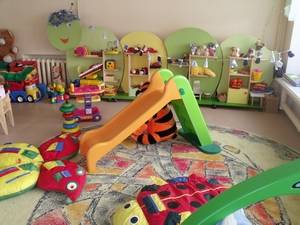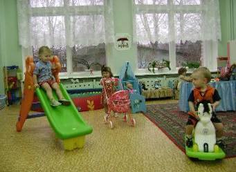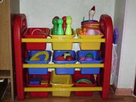 Рисунок 3. Оформление группы раннего развития Оборудование интерьера мебелью для малышей 2–3 года жизни может осуществляться с помощью отечественных и зарубежных изделий, предоставляемых современными фирмами. Столы, стулья, кровати для разных ростовых групп должны быть изготовлены из экологически чистых материалов. Для малышей конца 1-го и начала 2-го года можно рекомендовать деревянные кресла с регулируемым по высоте сиденьем. Столы – полудуги с выемкой в середине удобны для одновременного кормления двух или трех малышей. Два таких стола, сдвинутых торцевыми сторонами образующих стол круглой формы с выемкой в середине, удобны для одновременного приема пищи 6–7 детей. Эти же столы можно соединить зигзагообразно, что удобно для самостоятельной деятельности малышей. Для этого дуги 2-х столов соединяются выгнутыми поверхностями. Нужен раздаточный столик на колесиках. Мягкая мебель – кресла, диванчики для отдыха, обтянутые мягкими тканями разных оттенков – создает колорит домашности, уюта, но необходимо, чтобы она сочеталась со всеми другими предметами мебели в интерьере группы. Напольные шкафы, рассчитанные на рост маленького ребенка, незаменимы в интерьере группы как для детей 2-го, так и 3-го года жизни. В группе должна быть предусмотрена мебель для взрослых: кресло или небольшой диван, на которых воспитатель может почитать ребенку книжку, побеседовать с ним или отдохнуть в то время, когда малыши спят. Уют и тепло создают коврики, на которых малыши могут играть самостоятельно или вместе с воспитателем. Всё это способствует поддержанию доверительных отношений между взрослым и детьми. Детская игровая мебель по росту детей предназначается для групп раннего возраста, потому что дети 2–3 года, проигрывают какие-то эпизоды своей собственной жизни. Это сюжетно-отобразительные действия. Игровое оборудование помогает ребенку овладеть функциональными, чисто социальными действиями, отображающими быт человека, что позволяет малышу «вписаться» в окружающую действительность. Так проходит социализация ребенка уже в ранний период его жизни. Немаловажным является и то, что ассортимент игровой мебели выполнен гарнитурно. Закругленность форм представленных изделий не только снимает опасность травмы об острые углы, но и приятна для глаза, так как демонстрирует мягкость и плавность линий. Последнее, как установили психологи, определенным образом влияет на настроение, зрительную сенсорную систему организма ребенка. Резкие линии вызывают у маленького ребенка реакцию отстранения и не способствуют возникновению чувства защищенности и покоя. Это положение действенно и для окружающей среды в целом: она не должна быть визуально агрессивной. Мебель и оборудование располагаются так, чтобы осталось достаточное пространство для свободной двигательной активности детей. Малыши должны иметь возможность беспрепятственно ходить, ползать, бегать, кататься на маленьких велосипедах, возить за веревочку машинки, толкать перед собой тележки.
