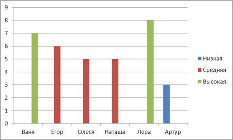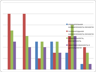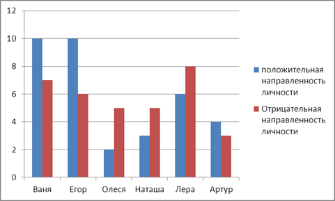 Рис.1. Сравнительный анализ результатов исследования детей с алалией по методике на выявление особенностей коммуникативного поведения у дошкольников Отрицательная направленность личности отмечается не у всех детей, и в разной степени выраженности. У Вани и Егора отрицательная направленность личности составляет 0 баллов, так как эти испытуемые на протяжении всей деятельности сотрудничали, не забирали фигурки друг у друга, негативных реакций по отношению друг к другу отмечено не было, попытки регулировать поведение партнера не отмечено. Отрицательная направленность Олеси и Наташи из всех испытуемых оценена в 5 баллов как самая высокая среди всех испытуемых. Они забирали фигурки друг у друга, на забирание фигурок реагировали негативно, попытки регулировать поведение партнера не отмечено, использовали в речи личные местоимения, не понимали слова «вместе», стремясь выполнить задание, на протяжении всей деятельности работали отдельно, в результате чего и была выявлена отрицательная направленность личности. Отрицательная направленность Леры составила 3 балла и Артура 1 балл. Этим испытуемые забирали фигурки друг у друга, на забирание фигурок реагировали негативно. Только по этим критериям у Леры и Артура была выделена отрицательная направленность личности, это поведение у них было отмечено в начале их совместной деятельности, затем испытуемые работали коллективно, всячески помогая друг другу. Общительность и контактность один из основных критериев, который важен при выявлении особенностей коммуникативного поведения. По результатам исследования высший балл по этому критерию получили: Лера 8 баллов, Ваня 7 баллов, Егор 6 баллов, Олеся и Наташа 5 баллов и Артур 3 балла. Все испытуемые были общительны и в разной степени выраженности входили в контакт. У всех детей была отмечена речь, обращенная к партнеру, речь обращенная к взрослому. Испытуемые, которые получили высшие баллы, а именно Лера, Ваня, Егор помогали советом партнеру, реагировали действием на советы партнера, именно поэтому получили высокие баллы. Следующий критерий по которому были оценены испытуемые- заинтересованность в предложенной деятельности. Все дети были заинтересованы и увлечены игрой «Собирание мозаики». Лера получила 6 баллов, Ваня 5 баллов и Егор 4 балла, Олеся 4 балла у этих испытуемых отмечены высшие баллы, Наташа получила 3 балла, Артур 1 балл. Все испытуемые были заинтересованы в предложенной деятельности, они строили сами или вместе с партнером, т.е. активно выполняли задание, давали советы и реплики по поводу работы, следили за работой партнера. По результатам исследования, нами установлено, что отрицательная направленность личности встречается у 67% испытуемых, положительная направленность личности встречается у всех испытуемых, т.е. 100%, общительность, контактность так же присуще 100% детей, заинтересованность в данной деятельности отмечена у 100% испытуемых детей. Но процентное соотношение по всем перечисленным критериям у всех испытуемых детей различно и индивидуально. Методика 3. Это методика предназначена для исследования коммуникативного поведения детей со сверстниками, по поведению ребенка взрослый судит о сформированности его морального поведения. Для реализации методики экспериментатор предлагает детям коробку и билетики. Испытуемы