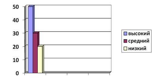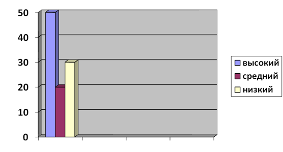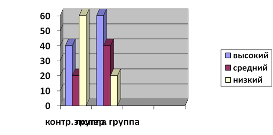 По результатам выполнения заданий I блока 50% (5 человек) показали высокий уровень успешности; 30% (три человека) показали средний уровень успешности, 20% (2 человек) показали низкий уровень успешности. Было выявлено, что при выполнении заданий I блока полностью справились дети контрольной группы, у всех детей высокий показатели. Они и составляют первую группу. 30% (три человека) имеют средний уровень успешности – дети экспериментальной группы. И 20% (2 человека) имеют низкий уровень успешности – дети экспериментальной группы. В ходе исследования было выяснено, что у всех детей экспериментальной группы (низкий и средний уровни) отсутствуют звуки [р] и [р`]. Результаты выполнения заданий II блока (исследование навыков словообразования) приведены в гистограмме (Рисунок 2) Рис. 2. Распределение испытуемых на группы по уровню сформированности навыков словообразования (%)
