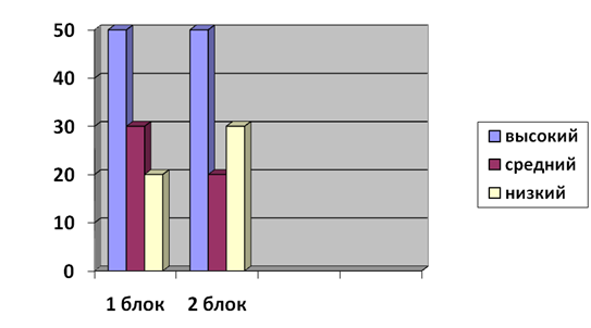 Таким образом, на основе количественного и качественного анализа результатов констатирующего эксперимента можно увидеть, что наибольшее количество испытуемых при выполнении заданий всех трех блоков находится на высоком уровне успешности (50% ). Часть испытуемых находится на среднем уровне успешности (от 20 % до 30%). Часть испытуемых находится на низком уровне (от 20% до 30%). Наибольшие трудности в выполнении у детей экспериментальной группы возникли в заданиях I блока. А наиболее успешно они проявляли себя в выполнении заданий II блока ). Сравнение результатов контрольной и экспериментальной групп по всем блокам заданий приведены в гистограмме (Рисунок 5). Рис. 4. Сравнительный анализ результатов выполнения заданий обоих блоков детьми контрольной и экспериментальной групп (%)