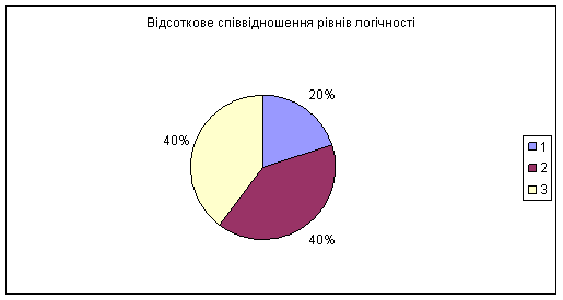 Малюнок 6. Діаграма логічності 1 – рівень вище середнього 2 – середній рівень 3 – низький рівень Список використаної літератури 1. Варій М.Й. Загальна психологія: Підручник для студентів психол. і педагог. Спеціальностей. - 2-ге вид., випр.. і доп. - К.: Центр учбової літератури, 2007. – 968с. 2. Зінченко В.П. Роздуми про розвиток мислення // Прикладна психологія. – 2001. - №1. с. 1 – 17. Мислення як дія // Прикладна психологія. – К.: Либідь, 1991. – 117с. 3. Косма Т.В. Мислення учнів молодшого шкільного віку. – К.: Рад.шк., 1968. – 206с. 4. Максименко С.Д. Загальна психологія: Навчальний посібник. – Видання друге, перероблене та доповнене. – К.: Центр навчальної літератури, 2004. – 242с. 5. Мироненко В.В., Петровський М.П. Загальна психологія. – М.: Просвітництво, 1987. – 408с. 6. М’ясоїд П.А. Загальна психологія. – К.: Вища школа, 2000. – 299-321 7. Немов Р.С. Психологія: В 3 кн. – М.: Владос, 1999. – с.273 – 311. 8. Пальм Г.А. Загальна психологія: Навч.пос. – К.: Центр учбової літератури, 2009. – 256с. 9. Петухов В.В. Психологія мислення. – М.: Вид-во МДУ, 1987. с.5 - 19. 10. Рубінштейн С.Л. Основи загальної психології: В 2т. –М.: Педагогіка, 1989. – Т.1. – 364с. 11. Солсо Р.Л. Когнітивна психологія. - М.: Трівола, 1996. – 458с. 12. Степанов О.М., Фіцула М.М. Основи психології і педагогіки: Посібник. – К.: Академвидав, 2003. – 504с. (Альма – матер) 13. Столяренко Л.Д. Основи психології. Практикум. – М.: Фенікс, 1999. – 292с. 14. Тихомиров О.К. Психологія мислення. – М.: МДУ, 1984. – с.6 - 16; с.211 - 231. |