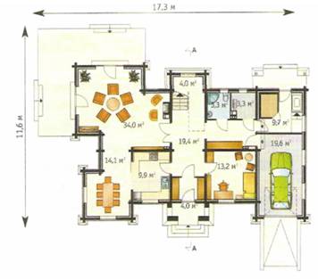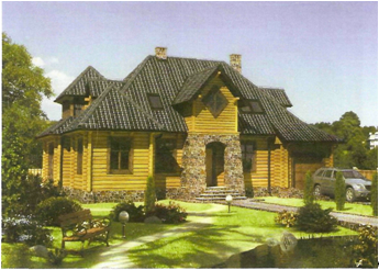 Рис. 1 Цей будинок (рис. 1) запроектовано київською архітектурно-будівельною компанією. Він може бути як місцем відпочинку, так і місцем постійного проживання. Ефектний заміський будинок з мансардою і гаражем. Особливий шарм додає проекту облицьовування каміння цоколя і вхідної зони. В дизайні екстер'єру дуже вдало поєднанні оздоблювальні матеріали (камінь, дерев'яний брус та темна черепиця) роблять екстер'єр будинку дуже затишним і теплим, що підкреслює також вдало підібрана кольорова гамма. Димарі будинку облицьовані також як і фундамент штучнім камінням, що підкреслює загальну стилістику будинку. Масивні, широкі віконні рами складають враження монолітності та статичності споруди, і також вдало виглядають на фоні світло тонованого деревинного брусу. Дах обладнаний слуховими вікнами, які створюють відчуття комфорту та затишку в спальнях другого поверху. На першому поверсі розташовано гараж, тамбур, санвузол, кабінет, вітальня, кухня та їдальня. Потрапивши в будинок попадаємо в тамбур, пройшовши трохи глибше праворуч розташована кухня ліворуч робочий кабінет, попереду знаходяться сходи на другий поверх. На другому поверсі розташовано три спальні, кабінет та два санвузли. Одна із спалень другого поверху обладнана великими мансардними вікнами і орієнтована на схід, тому раннє сонце завжди наповнює цю кімнату своїм промінням. Інтер'єр будинку виконано в теплих кольорах та використано дуже багато природних матеріалів, що підсилює ефект затишку і сприяє гарному відпочинку (рис. 2, 3, 4).