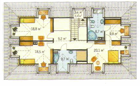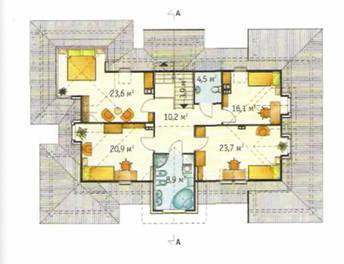 Рис. 8 Підлога майже всіх приміщень вкрита дубовою дошкою. Простір вдало збільшують дзеркала, що розташовані напроти вікон тераси. Вікна оформленні шторами із шовку, додатковою прикрасою вітальні служить великий килим на підлозі. Вітальня якби поділена на дві частини їдальнею і має великі вікна тераси, котрі прикрашені квітковими композиціями. Інтер'єр вітальні прикрашають масивні шкіряні дивани. Кухня і їдальня відокремлені стіною. В їдальні розмістився великий дубовий стіл з класичними стільцями. Також на першому поверсі знаходиться гараж який має два зручні входи в дім: один через коридор, а один в санвузол. П - образні сходи приводять на другий поверх де розташовано дві симетричні спальні, в одному крилі, санвузол та прохід, по центру та ще одна спальня та кабінет в іншому крилі будинку. Кожна із спалень має по два слухових вікна, під одним із вікон вдало розташовано стіл або диван, а під іншими квіткові композиції (рис. 9, 10).