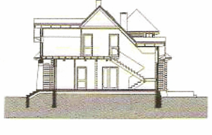 Рис. 5 Цей будинок (рис. 5) запроектовано київською архітектурно-дизайнерською компанією. Стильний двоповерховий будинок незграбної орієнтації. У архітектурі будівлі - тяжіння до готичної крівлі. Особливість фасаду рустовані кути. В основі аналога № 2 лежить асиметрична композиція. В розробленому будинку є багато великих вікон, що робить дім повним світла. На першому поверсі розташовано тамбур, спальня, кімната відпочинку та поєднанні вітальня кухня та їдальня, що робить цю кімнату дуже місткою та функціональною. На другому поверсі знаходиться три спальні та санвузол. В формі будинку поєднано готичні форми даху та фасад будинку курортного містечка. Кольорова гамма будинку складається з трьох кольорів, цокольна частина та деякі елементи фасаду облицьовані штучним камінням Скло відіграє особливу роль в інтер'єрі будинку. Повністю або частково виконані зі скла, предмети оформленні лаконічно й строго як, наприклад, у їдальні де довгий обідній стіл зі скляною стільницею оточений білими стільцями без прикрас. Довгий ряд металевих шаф, також має скляне оформлення. Світла плитка, білі стіни та стеля немов окресленні темними балками. Поєднанні вітальня і їдальня мають одну тематику: дивани і крісла які оточують невеликий скляний журнальний столик, що є центром цієї меблевої композиції. Великі світлі дивани кофейного відтінку контрастують із подушками темно-червоного відтінку. їдальня і кухня розділяються невеликою перегородкою - на ній з боку кухні перебувають полиці а з боку їдальні - ще один телевізор. Металізовані пластикові поверхні вбудованих шаф і бічної панелі робочої зони, що стоїть окремо, виконані в темно - червоному кольорі.