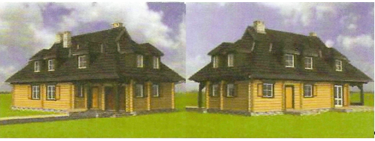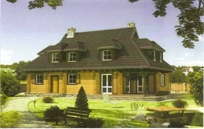 Рис. 7 Цей будинок (рис. 7, 8) запроектовано польською архітектурною фірмою «АКСИЕТСЖ». Мансардний будинок без підвалу з гаражем. Дуже затишний заміській будинок з цікавим вирішенням даху який має велику кількість слухових вікон. Перший поверх і мансарда спроектовані, як дві самостійно житлові зони. В кожній з них є санвузол та місця відпочинку. У будинку передбачено кілька входів: головний парадний вхід і додатковий літній через велику відкриту терасу. Дах будинку дуже вдало прикрашають слухові вікна з білою окантовкою віконних рам. В кольоровій гамі як інтер'єру, так і екстер'єру будинку в основному переважають теплі коричневі кольори. Як стіни так і елементи обробки інтер'єру та меблі в основному виготовленні з природних матеріалів.